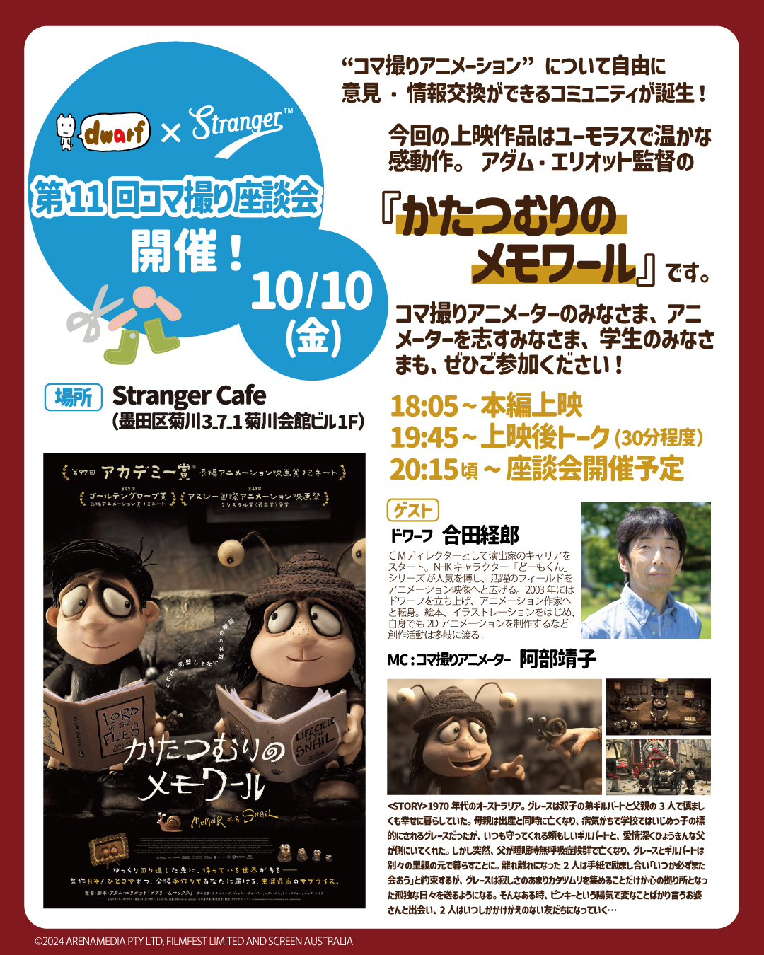 上映後のトークゲストは、ドワーフの合田経郎、そしてインタビュアーにコマ撮りアニメーターの阿部靖子さんを迎えます。